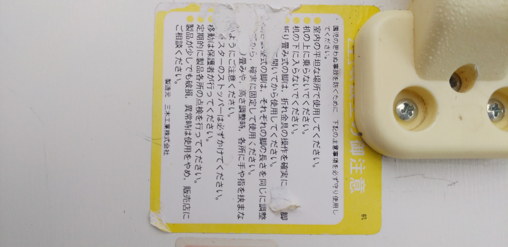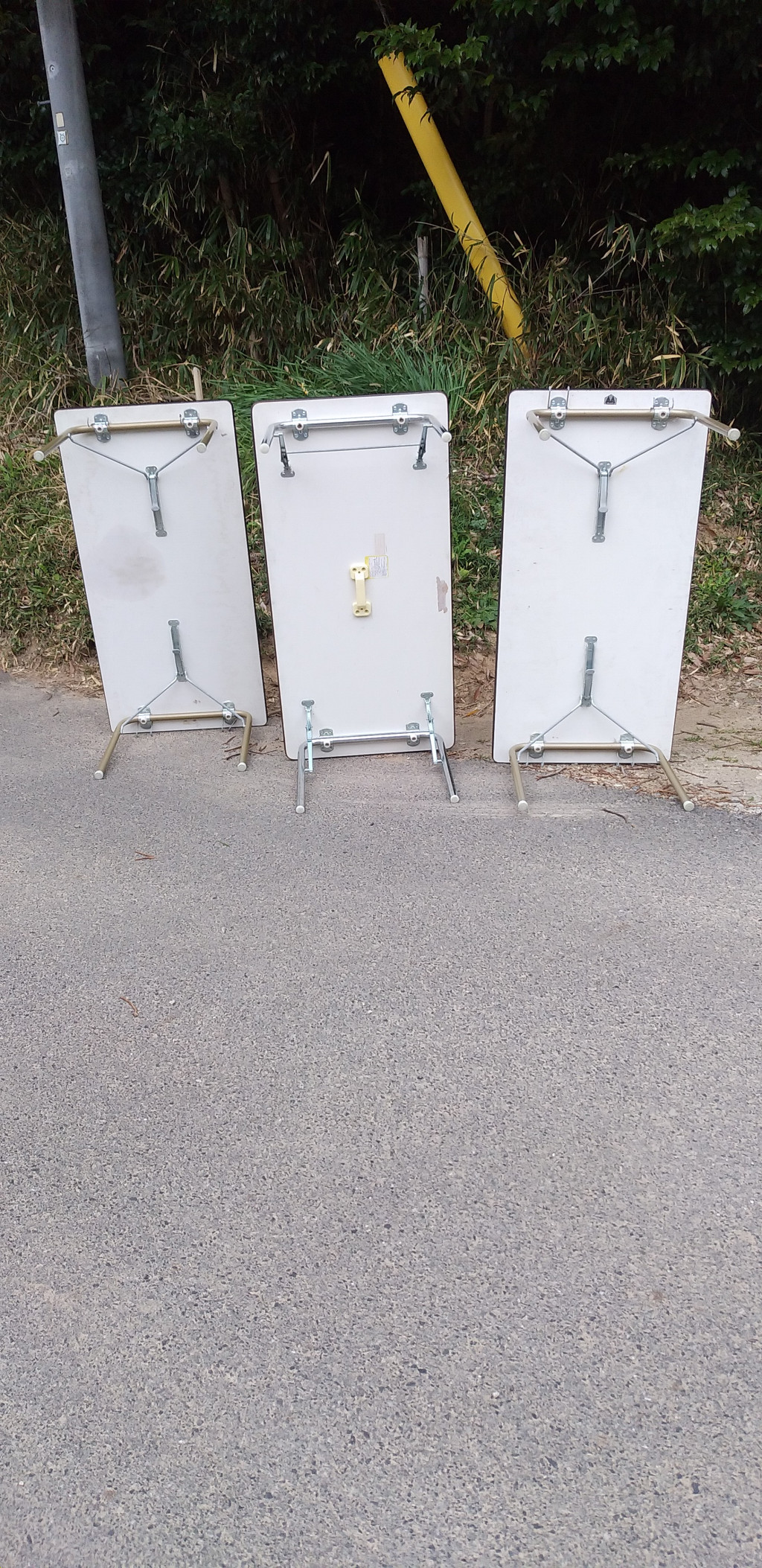 中古の幼稚園用テーブル3台。テーブルには傷がたくさんあり、錆びも少しあります。
