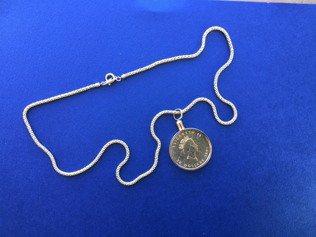 K24メイプルリーフエリザベスコイン1/2オンスインゴットK18フレームとK18ゴールドネックレス.